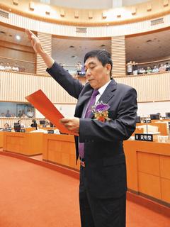 屏東縣議長黃國安一個月來當選2次,昨天上午終于宣誓就職。(圖片來源:臺灣《聯(lián)合報》)