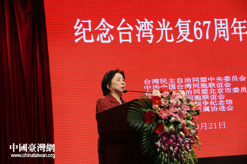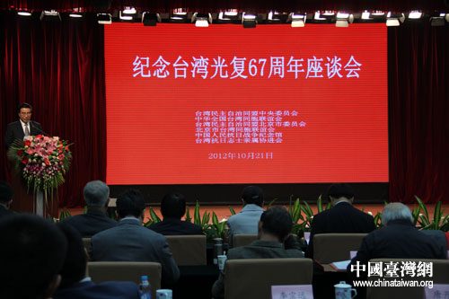 10月21日,由臺盟中央、全國臺聯(lián)及北京市臺盟、臺聯(lián),中國人民抗日戰(zhàn)爭紀(jì)念館、臺灣抗日志士親屬協(xié)進(jìn)會聯(lián)合舉辦的“紀(jì)念臺灣光復(fù)67周年座談會”在中國人民抗日戰(zhàn)爭紀(jì)念館舉行。(中國臺灣網(wǎng) 楊麗 攝)