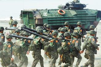 臺“立院”預(yù)算中心報告點出,臺軍面臨募不到兵、超過6成的志愿役士兵期滿不愿留營的憂慮。圖為兩年前臺軍海軍陸戰(zhàn)隊兩棲突擊車演練。圖片來源:臺灣《聯(lián)合報》資料照片