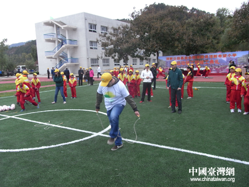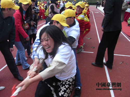 最激烈的集體項目拔河比賽在6(一)班和6(二)班進行,頂新各有五名大哥哥大姐姐加入雙方比賽,看他們多賣勁。(中國臺灣網(wǎng)記者 蕪同攝)