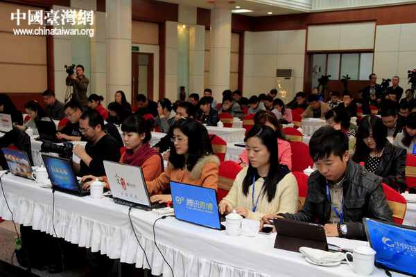 10月22日下午,甘肅省人民政府新聞辦公室召開新聞發(fā)布會(huì),向網(wǎng)絡(luò)媒體介紹蘭州新區(qū)情況。圖為參加新聞發(fā)布會(huì)的各家媒體記者爭(zhēng)相報(bào)道。 (中國(guó)臺(tái)灣網(wǎng) 董憲超 攝)