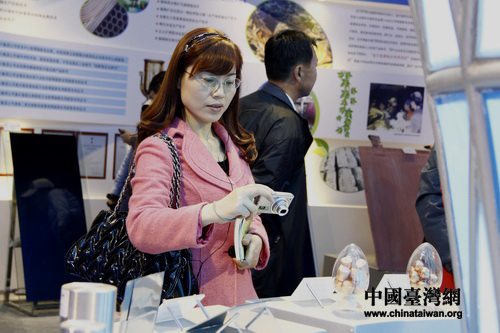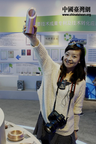 10月23日,“感知甘肅”第四屆網(wǎng)絡(luò)媒體采訪團(tuán)參觀考察金昌市循環(huán)經(jīng)濟(jì)發(fā)展?fàn)顩r。 圖為記者用相機(jī)記錄下循環(huán)經(jīng)濟(jì)成果展示臺的樣品。 (中國臺灣網(wǎng) 董憲超 攝)