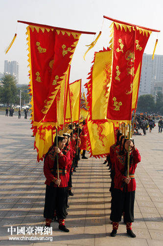 大祭幡隊(duì)伍在神農(nóng)城廣場(chǎng)整裝待發(fā)。(中國(guó)臺(tái)灣網(wǎng) 陳睿 攝)