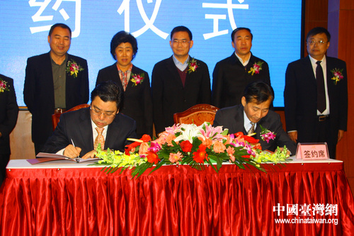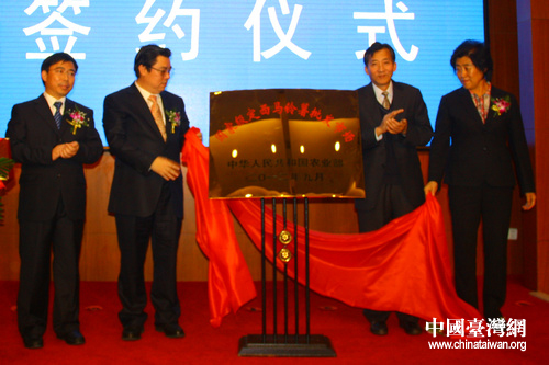 農(nóng)業(yè)部副部長陳曉華與甘肅省副省長冉萬祥簽署農(nóng)業(yè)部與甘肅省政府共建國家級定西馬鈴薯批發(fā)市場備忘錄。(中國臺灣網(wǎng) 郭瑩瑩 攝)