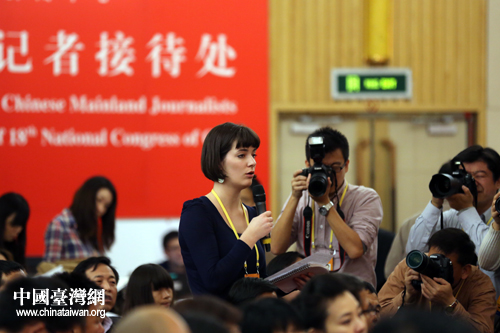 11月11日下午,十八大新聞中心在梅地亞中心二樓多功能廳舉辦中外記者招待會(huì),介紹文化體制改革和公共文化服務(wù)體系建設(shè)情況,并回答記者提問。圖為澳大利亞女記者提問。(中國臺(tái)灣網(wǎng) 王偉 攝)