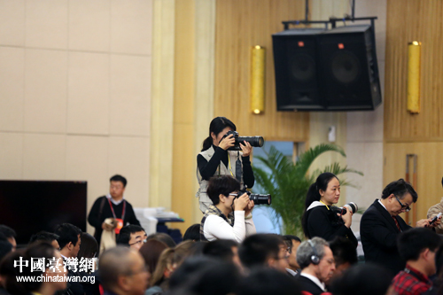 11月11日下午,十八大新聞中心在梅地亞中心二樓多功能廳舉辦中外記者招待會(huì),介紹文化體制改革和公共文化服務(wù)體系建設(shè)情況,并回答記者提問。圖為現(xiàn)場(chǎng)的攝影記者。(中國臺(tái)灣網(wǎng) 王偉 攝)
