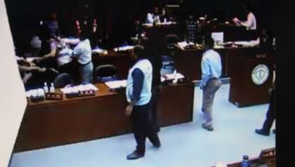 龍?zhí)多l(xiāng)代表會(huì)今日質(zhì)詢(xún)時(shí)上演全武行,多人掛彩。(圖片來(lái)自臺(tái)媒)