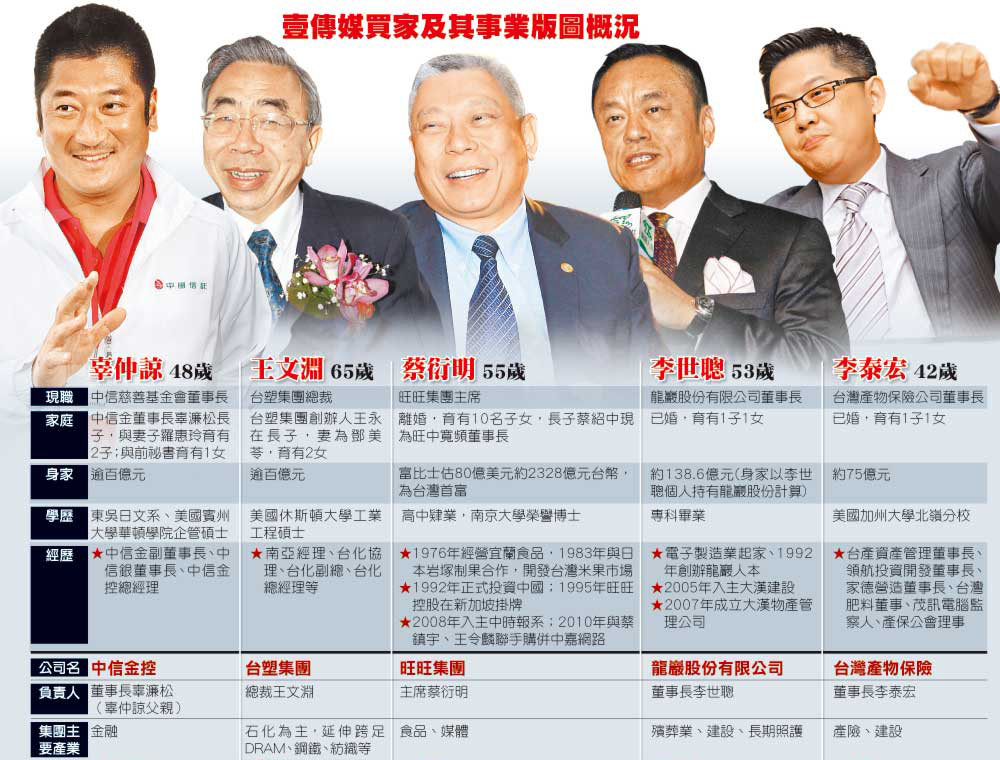 據(jù)報道,因受到相關(guān)規(guī)定限制,臺灣壹傳媒交易案拆分成“平面”與“電視”兩大類,由不同股東認購。其中《蘋果日報》《爽報》及臺灣《壹周刊》等平面媒體買家包括辜仲諒、王文淵、李世聰,以及蔡衍明長子旺旺中時集團總經(jīng)理蔡紹中,出資比率為辜仲諒20%、王文淵34%、李世聰14%與蔡紹中32%。