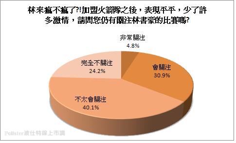 調(diào)查結(jié)果顯示,非常關(guān)注4.8%和會(huì)關(guān)注30.9%,兩者合計(jì)35.7%,雖不在少數(shù),但還是低于不太會(huì)關(guān)注40.1%和完全不關(guān)注24.2%合計(jì)的64.3%。相較在2012年初林書豪表現(xiàn)高檔時(shí),電視媒體每天放送最新消息,甚至還有專題報(bào)道,而現(xiàn)在只有在有比賽時(shí)顯示比分?jǐn)?shù)和最新戰(zhàn)況。相較于年初做的調(diào)查,當(dāng)時(shí)有近半數(shù)(46.5%)的民眾會(huì)因?yàn)榱謺蓝黾訉?duì)NBA的關(guān)注,民眾對(duì)林書豪的熱度似乎也略微下滑。