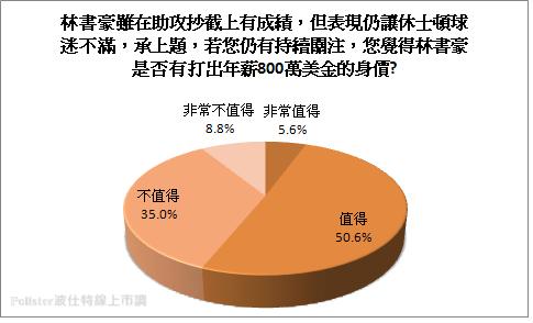 超過半數(shù)覺得林書豪拿的薪水符合他的身價(jià)(圖片來自臺(tái)灣“今日新聞網(wǎng)”)