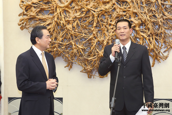 中共中央臺辦、國務(wù)院臺辦主任王毅今天下午在北京人民大會堂會見了臺灣鄉(xiāng)鎮(zhèn)市民代表會聯(lián)合總會蔡詠锝一行。圖為蔡詠锝發(fā)表致辭。(中國臺灣網(wǎng) 于斯文 攝)