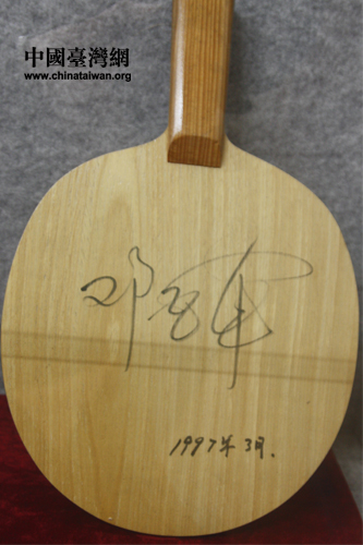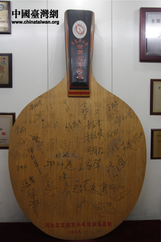 正定國家乒乓球訓(xùn)練基地內(nèi)展出寫有鄧亞萍簽名的乒乓球拍。(中國臺灣網(wǎng) 焦源源 攝)
