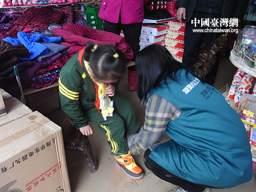 頂新公益基金會的周淑禎給留守兒童竇春燕買了一雙新鞋并親自給她穿上(中國臺灣網(wǎng)記者 蕪同 攝)