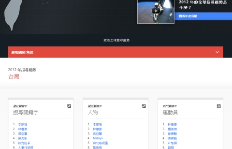 臺(tái)灣部分,李宗瑞雄據(jù)搜尋關(guān)鍵詞與人物搜尋榜雙料冠軍,同時(shí)進(jìn)榜的還有鳳飛飛,Makiyo與林益世等;而林書豪則為體育相關(guān)搜尋榜冠軍,代表臺(tái)灣登上奧運(yùn)殿堂的跆拳道選手曾櫟騁與楊淑君,乒乓球選手莊智淵也榜上有名。(中國(guó)臺(tái)灣網(wǎng) 李帥)