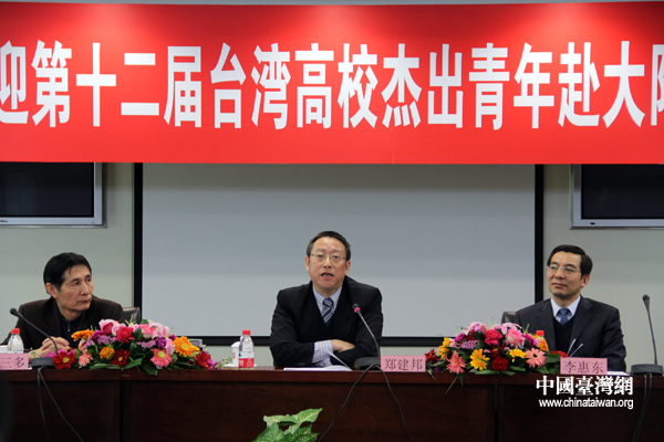 鄭建邦在會見中對參訪團(tuán)的到來表示了歡迎,他說,剛剛過去的2012年,在兩岸關(guān)系發(fā)展進(jìn)程上具有特殊重要的意義。年初臺灣地區(qū)兩項重要選舉結(jié)果表明,兩岸關(guān)系和平發(fā)展符合兩岸同胞的共同愿望,符合中華民族的整體利益,符合時代發(fā)展進(jìn)步的潮流。只要兩岸雙方沿著和平發(fā)展的正確道路堅定走下去,就一定能進(jìn)一步開創(chuàng)兩岸關(guān)系和平發(fā)展的新局面,也勢必給兩岸的青年才俊提供更為寬闊的展示才華的舞臺。