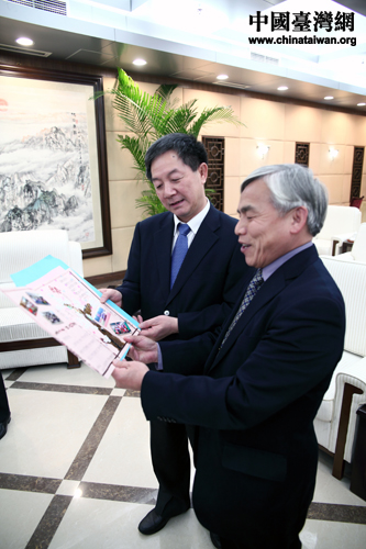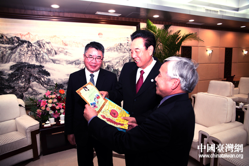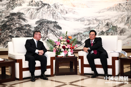 21日下午,海峽兩岸關系協(xié)會會長陳云林(右)在北京會見了來京交流的廣東東莞臺商子弟學校董事長葉宏燈(左),及其率領的該校校董、師生與家長代表。(中國臺灣網(wǎng) 于斯文 攝)