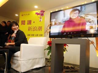 臺當局“文化部長”龍應臺(左前)邀請影星林青霞(圖右屏幕)擔任“文化大使”,推廣閱讀風氣,23日下午兩人視訊聯(lián)機,一同號召民眾加入閱讀行列。圖自臺媒