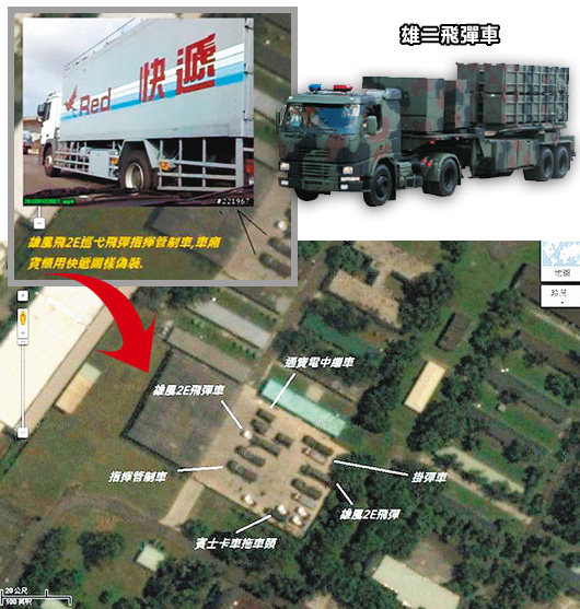 被鎖定解讀的基地圖像,被張貼于某博客上,位置在楊梅某高爾夫球場附近的導(dǎo)彈營區(qū),相關(guān)裝備雖掛有偽裝網(wǎng),但網(wǎng)絡(luò)軍事迷仍分別加以辨識,將圖像上的導(dǎo)彈拖車、發(fā)射車、資電中繼車構(gòu)型等一一加以注明。