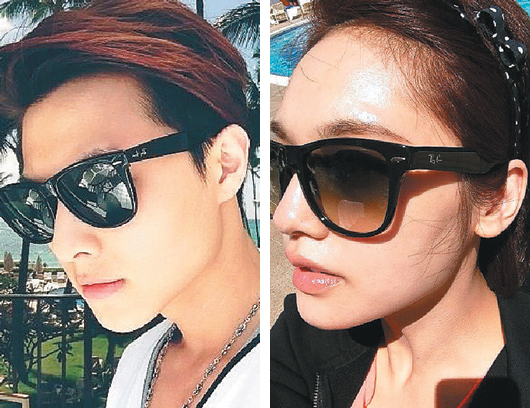 楊丞琳(右)與王子(左)分別在個(gè)人微博上傳戴太陽(yáng)鏡照片,眼尖網(wǎng)友發(fā)現(xiàn),兩人竟是戴同款式的情侶眼鏡。(截取自楊丞琳、王子微博)