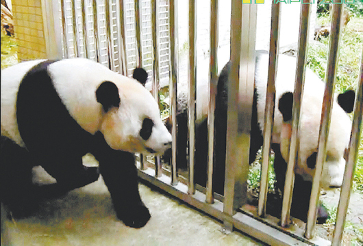 母貓熊圓圓(左)進入發(fā)情期,不斷磨蹭欄桿向團團(右)示好。圖片來自臺灣《聯(lián)合報》