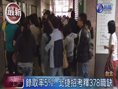 中國臺灣網(wǎng)3月25日消息 據(jù)臺灣“今日新聞網(wǎng)”報道,臺灣經(jīng)濟不景氣,油電雙漲之余,民生用品也跟著漲。臺北捷運公司擴大招募新血,在昨(24)日舉辦新進(jìn)人員筆試,需要招募378人,薪資依不同職務(wù)類別約為2萬9千元(新臺幣,下同)至5萬2千元不等,卻有6654人搶破頭,預(yù)估錄取率不到6%。