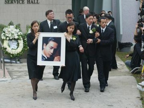 張國榮出殯時,唐鶴德(右二被攙扶者)傷心欲絕。(圖片來源:臺灣今日新聞網(wǎng))