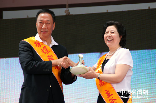 中共山西省委常委、宣傳部部長胡蘇平與郭臺(tái)銘互贈(zèng)禮物。(中國臺(tái)灣網(wǎng) 李典典 攝)