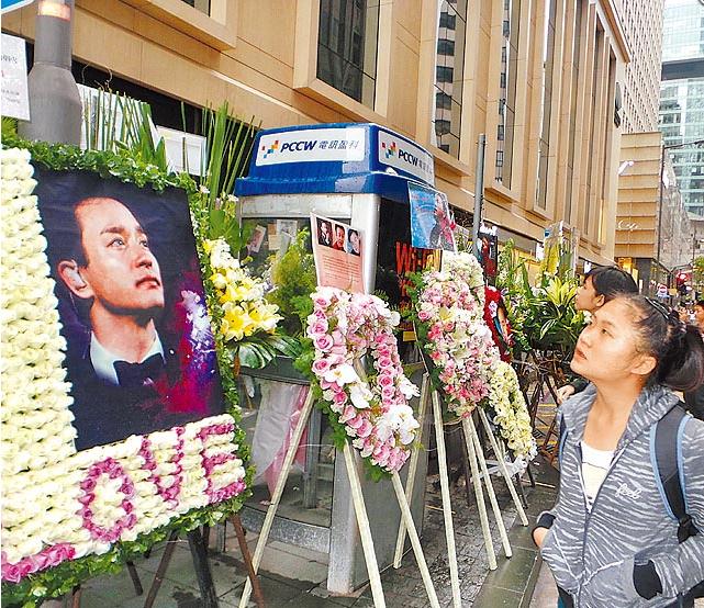 香港文華酒店外擺滿鮮花與張國(guó)榮照片,粉絲駐足欣賞。(圖片來(lái)自臺(tái)媒)