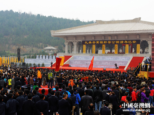 中國臺灣網(wǎng)4月4日黃陵消息 4月4日上午癸巳年(2013)清明公祭軒轅黃帝典禮在陜西黃陵縣舉行,萬余名海內(nèi)外中華兒女聚首陜西省黃陵縣橋山軒轅殿祭祀廣場,追念初祖功德,表達(dá)追思之情。