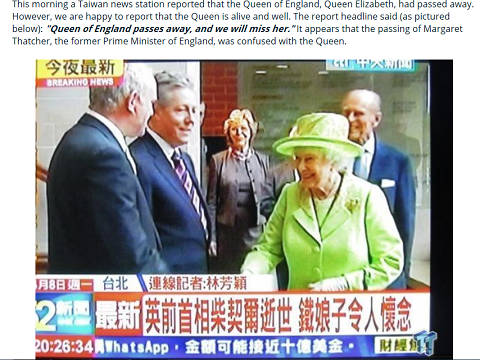 播報撒切爾夫人逝世消息時誤植英國女王伊麗莎白二世的畫面(圖片來自臺媒)