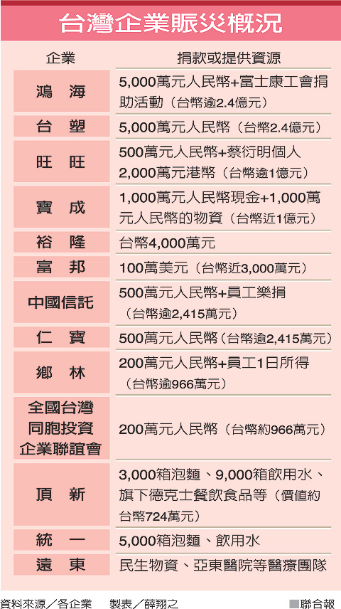 臺(tái)灣企業(yè)賑災(zāi)概況。圖片來(lái)源:臺(tái)灣《聯(lián)合報(bào)》