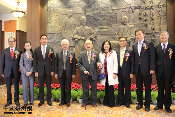 “林獻(xiàn)堂抗日事跡陳列館”暨北京五桂樓會(huì)館開館儀式4月28日在北京臺(tái)灣街五桂樓舉行。梁?jiǎn)⒊恿核级Y、林獻(xiàn)堂孫媳林芳媖以及十一屆全國人大常委會(huì)副委員長周鐵農(nóng)、臺(tái)中市副市長蔡炳坤在“梁?jiǎn)⒊c林獻(xiàn)堂浮雕”前合影。(中國臺(tái)灣網(wǎng) 何建峰 攝)