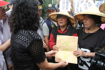 關(guān)廠工人向桃園法院書記長陳明琴遞交陳情書。(圖片來自臺媒)