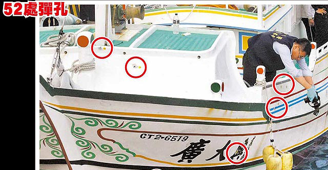 “廣大興28號”漁船11日凌晨被拖返屏東小琉球漁港,調查人員清點發(fā)現(xiàn)船身共有52處彈孔。紅圈處為彈孔位置。(圖片來自臺媒)