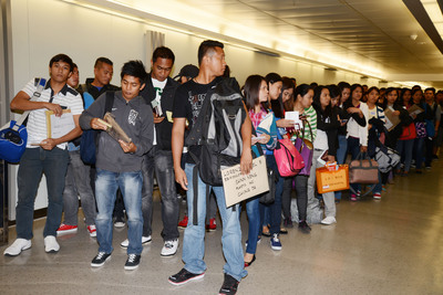 臺灣漁民遭菲律賓公務(wù)船射殺,馬英九11日對菲律賓下72小時通牒,菲律賓面臨勞工赴臺受限制裁。圖為12日最新一批搭機(jī)抵臺的菲律賓勞工。(圖片來自臺媒)