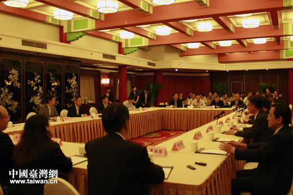 在兩岸企業(yè)家峰會(huì)秘書處,張志軍與在江蘇投資的臺(tái)商代表進(jìn)行了座談,了解臺(tái)資企業(yè)經(jīng)營情況,聽取他們對兩岸產(chǎn)業(yè)和企業(yè)合作的意見。