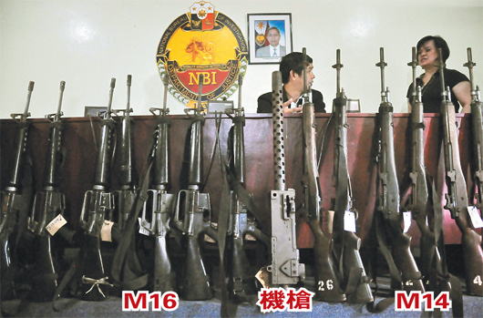 菲律賓國(guó)家調(diào)查局17日在馬尼拉總部召開(kāi)記者會(huì)前,展示一批由菲律賓海岸防衛(wèi)隊(duì)交給調(diào)查人員的武器,菲律賓槍擊臺(tái)灣漁船廣大興28號(hào)的武器就在其中。圖中為布朗寧機(jī)槍?zhuān)筮吰甙褳镸16步槍?zhuān)曳搅褳镸14步槍?zhuān)@兩型槍枝在越戰(zhàn)時(shí)期均被廣泛使用。(圖片來(lái)自臺(tái)媒)