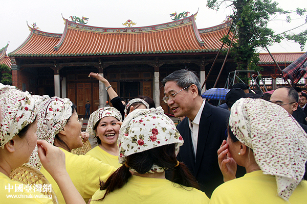 17日下午,在昆山慧聚寺參觀的中臺辦、國臺辦主任張志軍親切問候在場的臺灣義工。(中國臺灣網(wǎng) 楊麗 攝)