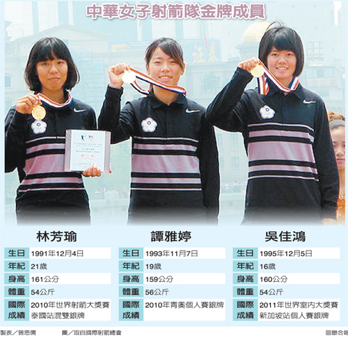 體壇“臺灣日”昨天由3名平均年齡20歲的女子團體揭開序幕,譚雅婷、吳佳鴻、林芳瑜連手在2013年射箭世界大獎賽上海站團體組射下金牌。