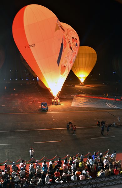 期待已久的熱氣球自由飛翔,在游客滿心期待下,包括臺(tái)灣心形球在內(nèi)的5顆熱氣球,順利升空,沿著海岸山脈,飛躍棋盤式的龍?zhí)镛r(nóng)村。接著穿過(guò)臺(tái)9線公路,降落在卑南溪旁。