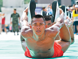 昨天下午動(dòng)態(tài)表演,陸軍海龍蛙兵首先上陣,精壯體格讓觀眾驚呼連連,在攝氏34度高溫下,鋪在地上的操作墊依然滾燙,蛙兵們不畏高溫,表演全跳、邊彎、邊腰、掌上壓等項(xiàng)目。