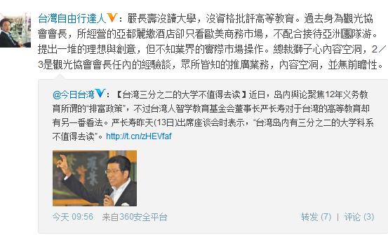此外,在新浪微博上,臺灣旅行公會總會理事兼觀光接待委員會召集人柯牧洲(“臺灣自由行達人”)表示,嚴長壽沒讀大學,沒資格批評高等教育,“三分之二”是經(jīng)驗之談,“內(nèi)容空洞,并無前瞻性”。(中國臺灣網(wǎng) 何建峰)