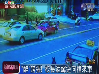 臺(tái)北一小學(xué)校長酒駕逆向撞紅色轎車,還倒車試圖肇事逃逸被民眾攔下。(圖片來自臺(tái)媒)