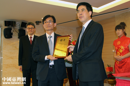 陳東榮為當(dāng)選監(jiān)事長的嚴(yán)世杰頒發(fā)當(dāng)選證書。(中國臺(tái)灣網(wǎng) 王思羽 攝)