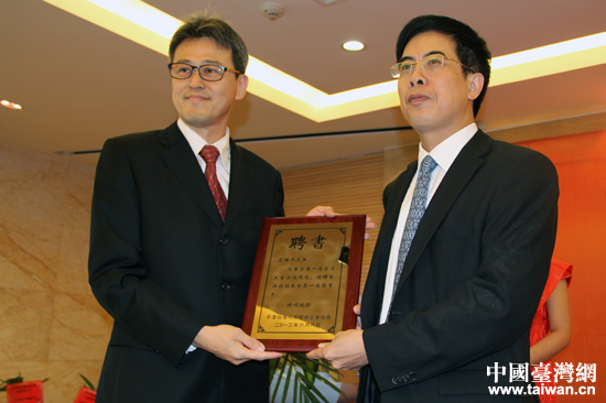 平潭綜合實(shí)驗(yàn)區(qū)管委會(huì)副主任陳東榮為當(dāng)選會(huì)長的李云輝頒發(fā)當(dāng)選證書。(中國臺(tái)灣網(wǎng) 王思羽 攝)