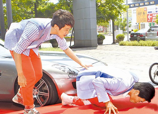 吳宗憲昨一下車就跪吻紅毯,笑翻所有人。左為陳漢典。(圖片來自臺媒)