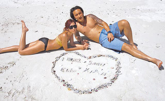 王陽明(右)2009年在沙灘上裸上身和穿比基尼的程穎婕親密合照。(圖片來自臺媒)