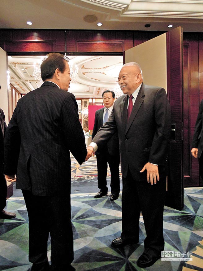 香港快哉行!謝長廷(左)抵達香港,前特首董建華(右)昨晚設(shè)宴接風(fēng)。雙方首次碰面,董建華笑著稱:“歡迎你來到香港!”(圖片來自臺媒)