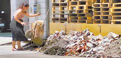 一名懷孕的女員工頂著烈日推獨(dú)輪車搬運(yùn)碎石。(圖片來自臺(tái)媒)