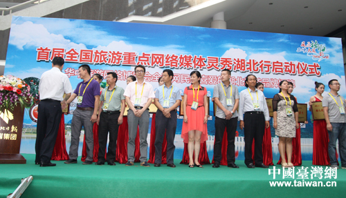 全國網(wǎng)民評選湖北最受歡迎的旅游品牌代表接受授牌。(中國臺(tái)灣網(wǎng) 李杰 攝)